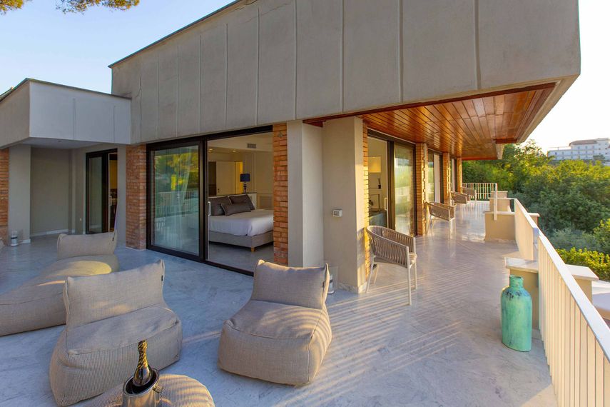 Tyylikkään terassihuvilan tilat (350m²) jakautuvat kahteen rakennukseen, tarjoten mukavaa majoitusta jopa 11 vieraalle. Kaksikerroksisen päärakennuksen tilava olohuone avautuu suurelle, kalustetulle näköalaterassille, ja ruokailutilan pitkä pöytä kutsuu viihtymään yhdessä. Täysin varusteltu keittiö palvelee vaativammankin kokin tarpeita. Yläkerrasta löytyvät kolme tyylikästä parivuoteellista makuuhuonetta, joista jokaisessa on oma kylpyhuone suihkulla. Erillisessä lisärakennuksessa on kaksi parivuoteellista makuuhuonetta, myös omilla kylpyhuoneilla. Päärakennuksen suurimman makuuhuoneen ylellisyyteen kuuluvat oma poreamme ja vuodesohva. Kaikista huoneista on suora pääsy terassille, jolta aukeaa lumoava merinäköala.