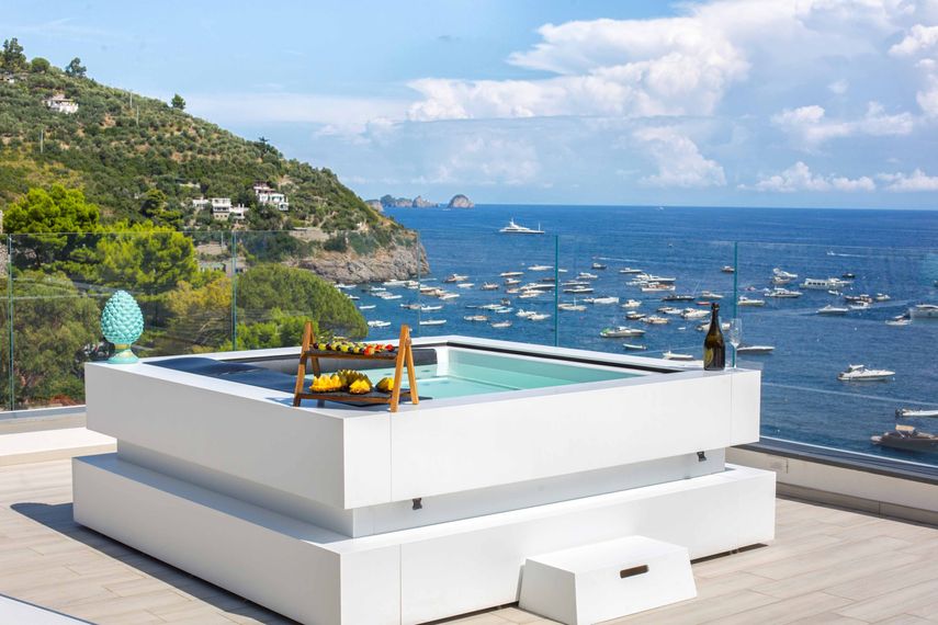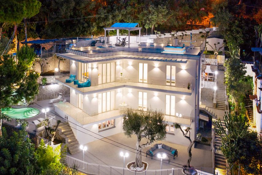 Huvilan eri tasoihin rakentuvilta ulkoalueilta löytyy kaunis, kaarevan muotoinen mosaiikkiallas, kivestä rakennettu pizzauuni ja grilli. Huikealla, 170 neliön kalustetulta kattoterassilta avautuu lumoava näkymä Napolinlahdelle, ja poreallas tarjoaa täydellisen paikan rentoutumiseen. Terassin katoksen alla on lisäksi pieni kuntoilutila. Kiinteistön alueella on yksityinen pysäköintitila kahdelle autolle.
