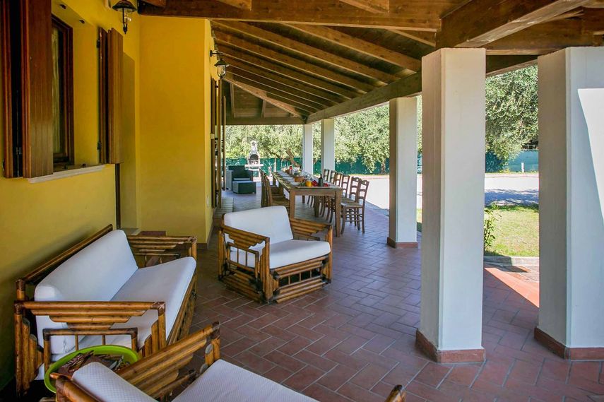 Huvilan edustalla on ihana kalustettu kuisti, jossa on ruokapöytä ja sohvia sekä lepotuoleja leppoisia illanviettoja varten. Rakennusta ympäröi aidattu puutarha, jossa kasvaa kymmeniä oliivipuita. Vieraiden käytössä on tiiligrilli ja lapsille on leikkialue. Huikealla näköalapaikalla on uima-allas, jonka koko on 5 x 9,5 metriä. Tie on perille saakka päällystetty ja parkkipaikkoja on huvilan vierellä.