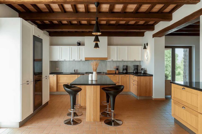 Noin 180-neliöinen huvila yhdistää perinteisen arkkitehtuurin ja nykyaikaisen mukavuuden tasapainoiseksi kokonaisuudeksi. Oleskelutilat ovat avaria ja harkitusti viimeisteltyjä; terrakottalattiat, tammiset kattoparrut ja vanha takka luovat ajattoman tunnelman. Keittiö on moderni ja korkeatasoisesti varusteltu, ja sen keskussaareke tekee ruoanlaitosta luontevan osan yhdessäoloa. Alakerran valoisa työhuone kylpyhuoneineen soveltuu myös makuutilaksi ja avautuu suoraan terassille ja puutarhaan. Yläkerrassa sijaitsevat kaksi kylpyhuonetta ja kolme makuuhuonetta, joista jokaisella on oma ilmeensä. Yhdessä makuuhuoneessa on erillisvuoteet, muissa parivuode, ja lisäksi on vuodesohva, josta tarvittaessa saa sijattua lisävuoteen.