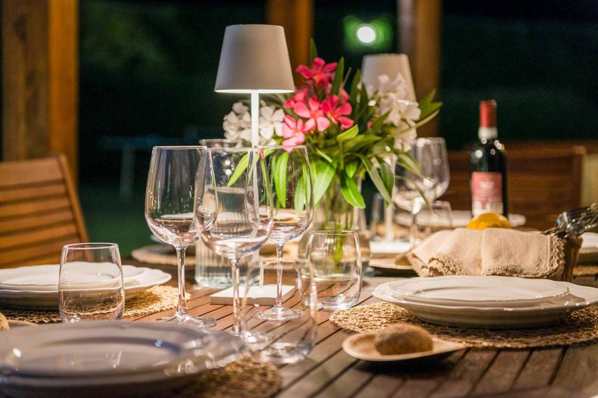 Kolmeen kerrokseen jakautuvassa huvilassa on majoitus kahdeksalle lomavieraalle ja tilaa reilut 160 neliömetriä. Sisääntulokerroksessa on avara oleskelu‑ ja keittiötila, jonka suurista ovista kuljetaan suoraan katetulle terassille. Tällä tasolla sijaitsevat myös kaksi makuuhuonetta, joissa on parivuoteet, sekä yksi kylpyhuone suihkulla. Yläkerran parvella on makuuhuone kahdella erillisvuoteella. Pohjakerros avautuu puutarhaan ja muodostaa toisen, itsenäisen oleskelualueen. Myös täällä on keittiö, suuri ruokailutila, oleskelunurkkaus ja vuodesohva, joka lisää joustavuutta majoitusjärjestelyihin. Samassa kerroksessa on myös kylpyhuone suihkulla ja pesukoneella. Kokonaisuus on suunniteltu niin, että jokainen kerros tarjoaa oman rauhallisen tilansa, mutta yhteiset alueet kutsuvat viettämään aikaa seurustellen. Katettu ja valaistu patio toimii romanttisena ulko‑oleskelutilana, jossa on sohvia ja suuri ruokapöytä.