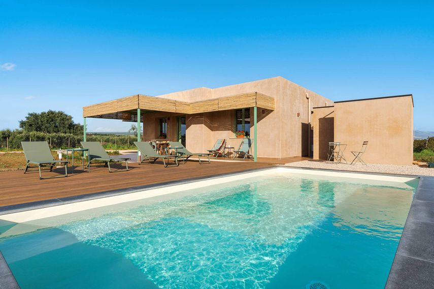 Puutarha on noin 1000 neliömetrin kokoinen, ja se muodostaa vehreän, yksityisen keitaan, jota täydentävät pergolan varjostama patio sekä aurinkoterassi. Aidattu huvila tarjoaa rauhallisen ympäristön rentoutumiseen. Suolapuhdisteinen uima-allas on kooltaan 3×6 metriä, ja siinä on vesihierontalaitteisto. Ulkosuihku, aurinkotuolit ja grillipaikka viimeistelevät pihan, joka sopii erinomaisesti lomapäivien viettoon Sisilian auringosta nauttien. Vieraiden autoille on parkkipaikka huvilan vierellä.
