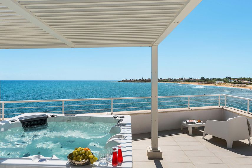 Hiljattain rakennetun huvilan katolla on aurinkoterassi ja edustalla on suuri kaksisaataneliöinen meriterassi, jolta on viehättävä näkymä Avolan rannikolle. Pihakalustein varustetulla terassilla on ulkogrilli ja suihku. Vieraiden autoille on parkkipaikka.