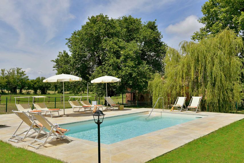 Laaja ja tasainen nurmipeitteinen puutarha on ihanteellinen rentoutumiseen ja ulkoiluun. Sen keskiössä on aidattu 8x4 metrin kokoinen uima-allas, jota ympäröi leveä laatoitus. Vieraiden käytössä on pergoloilla suojattuja ruokailuryhmiä ja tietysti ulkogrilli. Huvilan vieressä on katettu pysäköintialue viidelle autolle. Santa Mariaan voi saapua myös omien lemmikkien, kuten koirien, kissojen tai jopa hevosien kanssa, sillä käytettävissä on hevoshaka ja talli. Koirille on aitaus ja koppeja, ja niitten mielestä on yleensä hauskaa pulikoida läheisessä joessa. Ympäristön sypressit ja maastopyöräilyynkin sopivat metsäiset polut täydentävät kokonaisuuden, joka sopii erinomaisesti lepolomaa etsiville.