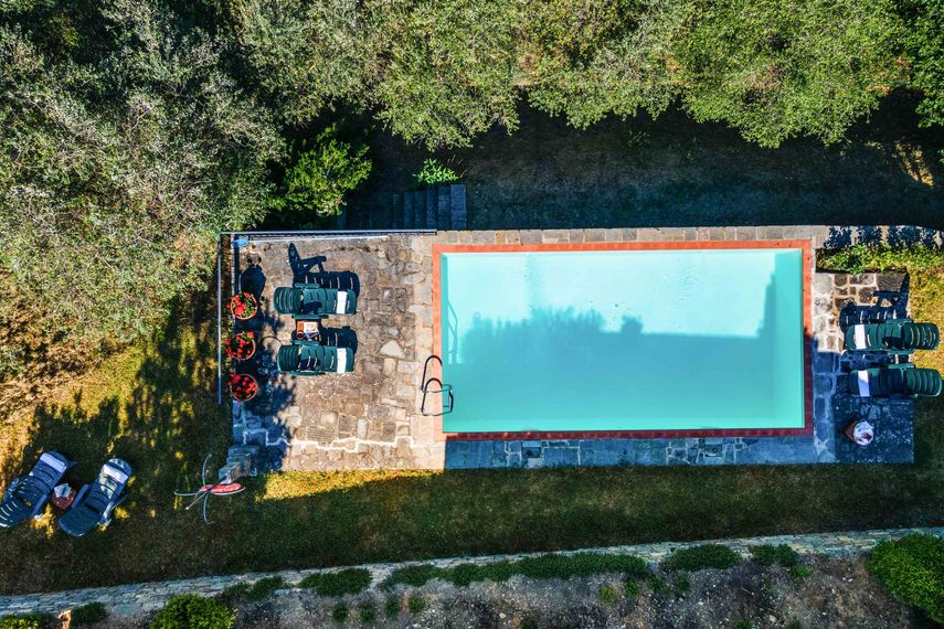 Kohdetta ympäröi viiden hehtaarin laajuinen, oliivilehtojen täplittämä metsäalue. Ulkoalueita täydentää upea kalustettu terassi, jossa voi nautiskella upeista maisemista ja alueen rauhasta. Alempana sijaitsevan uima-altaan (4x8m) ympärillä on aurinkotuolit ja ulkosuihku. Vieraiden käytössä on grilli sekä puu-uuni ja pysäköintialueelta löytyy myös katettuja autopaikkoja.